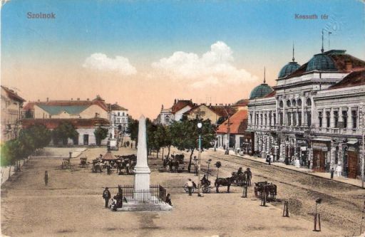 A Vasúti levelezőlapárusítás nevet viselő fővárosi cég 1915-ben jelentette meg a szolnoki Kossuth teret ábrázoló, színezett képeslapot. Mivel a távolban kikandikáló mai Varga épülete előtt balra, a Dózsa György út sarkán álló biztosítós bérház tetejét is felfedezhetjük a képen, talán nem tévedünk nagyot, ha azt mondjuk, hogy az eredeti fotó valamikor 1910 és 1915 között készült. Jobban megnézve, azt is bátran leszögezhetjük, hogy a fotós annak a Steiner-féle háznak az emeleti ablakából készítette a felvételt, amit valamikor a hetvenes évek elején bontottak el a tér nyugati végéből, ma pedig a kövezett rendezvénytér van a helyén.