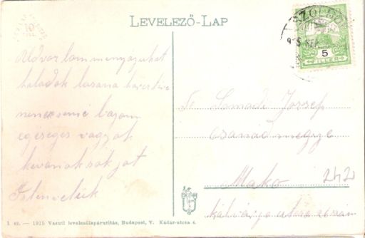Ezt a képeslapot is nyugodtan kiállíthatnánk az első világháború centenáriumára emlékező kiállításon, hisz a feladója egy olyan fiatalember volt, aki Szolnokot érintve, a keleti frontra tarthatott. Talán sietségében nem írta alá az anzikszot, amit Somodi Józsefnek küldött az akkori Csanád megye székhelyére, Makóra, azon belül is a Kálvária utca 26. szám alá. Üzenete, mai átiratban így szól: „Üdvözlöm mindannyijukat, haladok lassan a harctérre, nincs semmi bajom, egészséges vagyok, kívánok sok jót. Isten velük”. Ha tippelnem kellene, azt mondom, egy frontra induló fiú írt szüleinek kapkodva a szolnoki állomásról. És remélem, nemcsak a szüleivel volt az Isten, hanem vele is a harctéren, ahová nem jószántából indult.