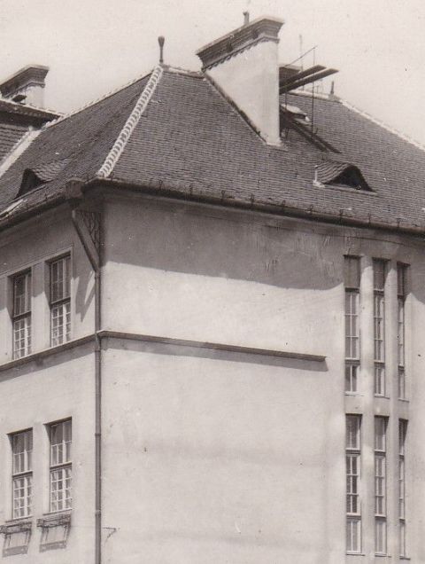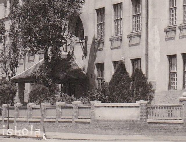 A legszebb azonban az épület főbejáratának a környéke. Az intézmény határait téglából és fából készített praktikus kerítés jelöli ki – nem érdemes összehasonlítani a mai utódjával -, ami ívesen, mintegy ölelően, tölcsérszerűen (?), utat kijelölve vezet a kapuig. A pince miatt odáig felvezető lépcső fölött Kós Károlyt idéző, oszlopokon álló féltetőt látunk. Az első emelet közepén pedig egy boltíves erkélyt. Ez utóbbi gondolom, az igazgatói vagy a tanári szobából nyílhatott. Ezeknek sincs már nyomda.