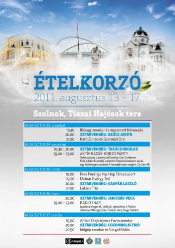 – Próbáltuk úgy összeállítani ennek az öt napnak a programját, hogy minden korosztály találjon kedvére valót. Az első napon Szűcs Judith, illetve szerdán Varga Miklós talán inkább az idősebbeket szólítja meg, míg a középső napokon Takács Nicolas, Janicsák Veca és Gáspár Laci a fiatalok kedvence lehet. Mellettük fellép Kató Zoltán szaxofonos, aki az új, népzenei feldolgozásokat tartalmazó lemezéről is játszik majd. De hasonló csemege lesz szerintem a Molnár Gyula Lyra-díjas harmonikaművész fellépése is. A zárónap pedig Szolnokról szól majd, hiszen az Alföldi Olajbányász Fúvószenekar mellett Cozombolis is fellép. Két este pedig a helyi rádiók, az Aktív és a Rádió 1 gondoskodik az utcabáli hangulatról.