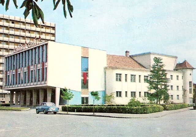 Az azonban nem igaz, hogy az 1963-ra teljesen lepukkant színháznak azért kellett ilyen, a szocreál építmények között is kirívóan ormótlan vasbeton főbejáratot kreálni, mert a szomszéd telken álló toronyház külleme ezt kívánta meg. A toronyházat ugyanis csak 1966-ban építették. Tehát a színház tervezőjének minimum jövőbelátónak kellett volna lennie – ami persze nem kizárt. Az pedig egyenesen a parasztvakítás kategóriájába tartozik, hogy az épület hátsó traktusához meg azért nem nyúltak, hogy az átvezessen a Tisza szálló stílusába. Nem kell szakértőnek lenni ahhoz, hogy belássuk, a húszas és negyvenes években is foltozgatott színháznak építészetileg már semmi köze nem volt a szálló stílusához.