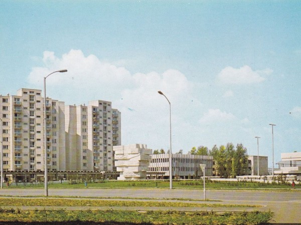 Amennyiben a fotózás pillanatában Csobaji balra fordította volna a kameráját, még nem tudta volna megörökíteni a később Csanádi körútinak nevezett OTP-t, a Tisza cipőboltot, de a József Attila lakótelep általános iskoláját sem, hiszen az is még csak épült 1976 tavaszán. Az „ívházak” Bajcsyhoz közelebbi részei már ugyancsak állhattak (üresen), ám az először az Állami Biztosítónak, a Márka ABC-nek és a Gazdaboltnak helyet adó épületek még ugyanúgy csak szerkezetkészek voltak, mint az ezen a fotón látható bizományi, katonai ruházati bolt, és volán iroda. Jobbra fordulva a 24 emeletesben már lakókat is fotózhatott volna a riporter, viszont a mögötte lévő Szolnok ABC és étterem talán még csak az alapozásnál tarthatott, hiszen az majd csak 1978. január 30-ára készült el. Így nem volt mit tenni, úgy kellett megörökíteni Gyurcsek Ferenc munkáját, hogy a még szintén csak szerkezetkész Csomóponti Művelődési Ház kerüljön mögé. Nem véletlen, hogy a képeslap nagyjából 70%-a a kék eget mutatja.