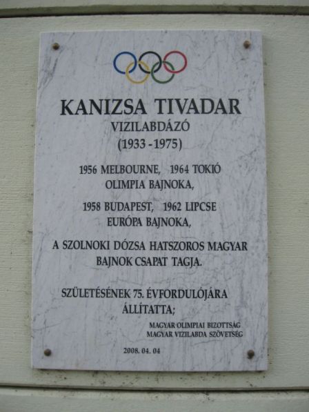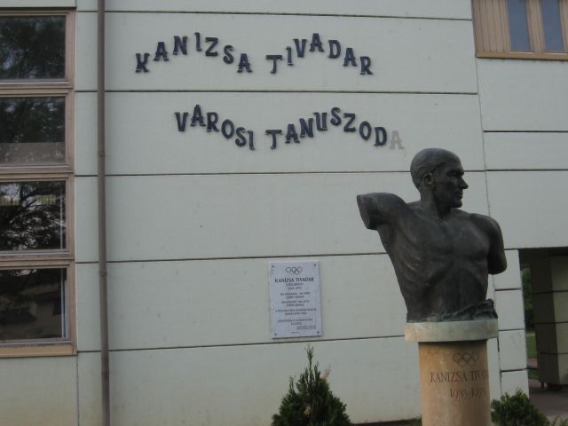 Ha emlékeim nem csalnak, akkor a Kodály Zoltán Általános Iskola mögötti tanuszoda csak jóval a megnyitása után vette fel Kanizsa Tivadar nevét, és az őt mintázó szobor is csak 1994-ben került mai helyére. A Pogány Gábor Benő által készített mellszobor bizonyos szögből nézve akár egy kompozíciónak is tekinthető, az uszoda falára később került felirattal és emléktáblával.