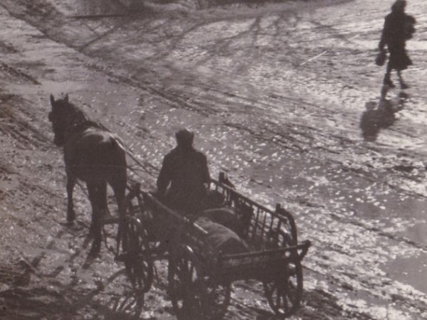 Egy fel nem adott képeslap, ami a hátlapja és papírja alapján egyértelmű, hogy valamikor a második világháború előtt készült. Állóformátumú, előterében egy talán zsákokat szállító klasszikus lovaskocsi – egy lóval -, az út túloldalán egy kezében táskát tartó, talán elegáns, szoknyás nő. Ha a lovaskocsi haladási iránya felé nézünk, kanyarodik az út, korláttal védett járdán két alak halad, az egyik talán gyerek. A kép felső részében sövénnyel kerített park, havas táj. Tökéletes fotó esszé egyetlen képen. Szinte érezzük a téli hideget, amin az erőlködő, árnyékokat vető déli napsütés sem tud segíteni. Gyerekkorunk telei idéződnek egy lassan kilencvenéves téli képen, ami olyan tökéletes kompozíció, hogy akár a magyar fotográfia legnagyobbjai – Brassai, André Kertész vagy Robert Capa – is készíthették. Akár. De hol?