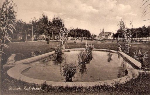 Néhány hónappal ezelőtt, egy 1935-ben postára adott, és a szolnoki Tóth Tamás parkot ábrázoló képeslap kapcsán nyílalt belém először a felismerés, miszerint elképzelhető, hogy valamikor két békás szökőkút díszítette Szolnok első és egyben legnagyobb, tervezett közparkját. Az akkori sejtést a bő nyolcvanéves fotó homályba vesző hátterére alapoztam, amelyen teljesen úgy tűnik, mintha a megörökített békás medencétől távolabb – a híd irányában -, egy másik, hasonló formájú medence is lenne. Sajnos az elmosódó fekete-fehér felvételen nem látszik egyértelműen, hogy a fotózáskor működött-e a kút, viszont az alakja és a kivehető növényzet nagyon hasonlít a kép előterében lévőre.