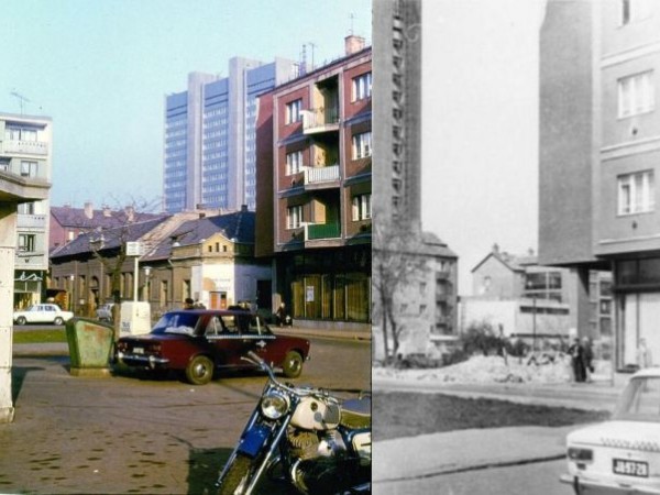 Kezdjük a régiebbi fotóval, a színes képpel! Az ismeretlen fotós valahol a mai rendezvénytér helyéről dolgozott, ahol még másfél évtizeddel ezelőtt is parkoló volt. A kép korát a hatvanas évek elején épült Múzeum éttermes társasház és a színe miatt „fradi ház” között látható Vízügyi székház segít meghatározni, hiszen, ha az már szerkezetkész volt, akkor legalább 1973-ban kellett dolgozni a fotósnak. Szerkezetkészségét egyébként a tetejéről még hiányzó vörös csillag, az ott lévő daruk, illetve a mai Boldog Sándor István – akkor Ságvári Endre – körút felőli oldalon álló külső lift is igazolja.