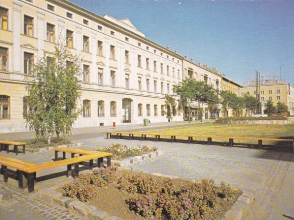 Például a múzeum főbejáratának rettenetesen ronda vas-üveg kapuját. Amit parádésan keretez a zöld közműszekrény, illetve a betonkorongon álló, mégis mobil, piros szemeteskuka. Az egykori Magyar Király átadása óta eltelt bő 170 évben sokféle homlokzata volt ennek az épületnek, de azt hiszem, megállapodhatunk abban, hogy a múlt század nyolcvanas éveiben volt a legsematikusabb és legkevésbé szépnek mondható. És ez talán a kép előterében látható sárga-fekete padsorról is elmondható, ami sok mindenre alkalmas volt, kivéve a téren való ücsörgésre. Bár tegyük hozzá, akkoriban a téren dübörgött át a négyes út, tele Kelet felé tartó, a környezetvédelemmel még nem igen törődő kamionnal, így egy itteni hosszabb ücsörgés pár doboz cigaretta elszívásával érhetett fel.