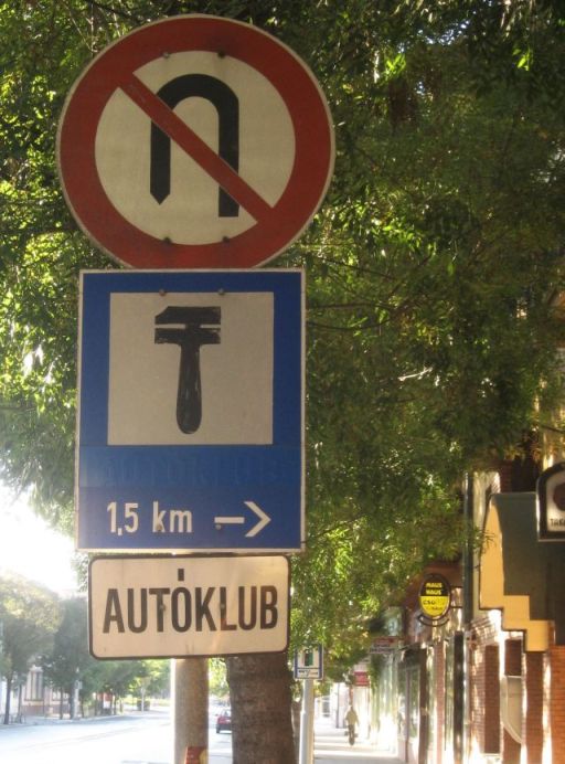 Ennél sokkal kevésbé zavaró, pontosabban csak félrevezető az az elfelejtett tájékoztatótábla, amelyik a Baross utca lombos fái közül nem is látszik ki. A nagyjából a hangszerbolt előtt felejtett kék tábla és a kiegészítője arról tájékoztat – félre -, hogy egy jobbkanyar után másfél kilométerre szervizt találok, mégpedig az Autóklub által működtetettet. Aki emlékszik erre a szervizre, az tudja, hogy már nem létezik a Rékasi úti felüljáró mellett, vagy ha javítanak is ott valamit, azt jó ideje nem az Autóklub színeiben teszik. Igaz, a táblát követő jobbra fordulást se nagyon javasolnám senkinek, mert a forgalom átszervezése miatt könnyen ugyanide jut vissza az autós. Akit Szolnokon ilyen formában is kísért a múlt.