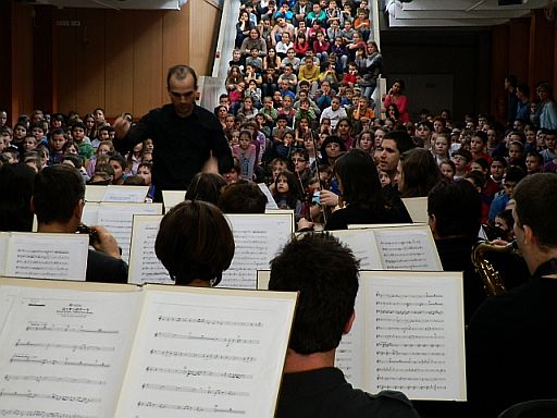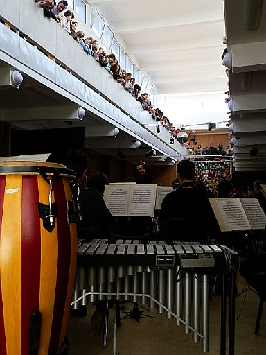 Lehet, hogy egy általános iskola aulája, ahol egyébként ebédelni, diszkózni, tornázni vagy várakozni szoktak a gyerekek, nem a legalkalmasabb koncertteremnek. A Fiumei úti iskolában január 31-én mégis úgy tűnt, ez sem a zenészeket, sem a népes közönséget nem zavarja. Ráadásul ebben a térben is remekül szólaltak meg a szimfonikusok, akik nem hakninak tekintették a fellépést.