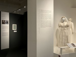 A fentebb már említett harmadik blokk, a személyes rész nemcsak nagyon kortárs menyecskeruhákból, lagzikról szóló kisfilmekből és természetesen egy nagy fotóadatbázisból áll, hanem egy hatalmas, tényleg feldolgozhatatlan menyasszonyi fejdísz gyűjteményből is. Egykor ezeket különleges keretekben helyezték el, amelyeket olykor fotókkal, feliratokkal egészítettek ki. Azt hiszem, nem véletlen, hogy a népviseleti menyasszonyi ruhákat is itt, és nem a „modern”, általában fehér ruhák között helyezte el a kurátor. Ráadásul olyan ötletesen, hogy a hatalmas falra applikált több tucat ruha minden oldala jól látható, sőt legálisan a szoknyák alá ibe is lehet nézni, számolgatva az alsószoknyákat.