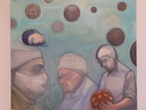 Meg talán azért sem, hogy laikus kiállítás-látogatóként nem igazán tudtam értelmezni, feldolgozni és befogadni azt a huszonöt nagyobb és tizenkilenc kisebb festményt, amelyek most elfoglalják a Galéria falait. Amelyek némelyikén feldarabolt emberek, szerteszét heverő testrészek, nagyon absztrakt fejek, elsőre megdöbbentő tárgytársítások láthatók, többnyire lehangoló színekből kikeverve. Képzőművészetileg alulművelt, képzetlen, analfabéta vagyok, és csak kétségbeesetten igyekszem megérteni, hogy mégis mit akar a művész, mi a cél, az üzenet. Éppen ezért kapaszkodnék minden plusz információba. Na de csak a kép címe kevés. Még akkor is, ha ebben az esetben érzékelhető, hogy a festmény és a cím rendkívül szoros kapcsolatban áll egymással, sőt, az utóbbi igyekszik megértetni az előzőt. Ám nem mindig sikerül.