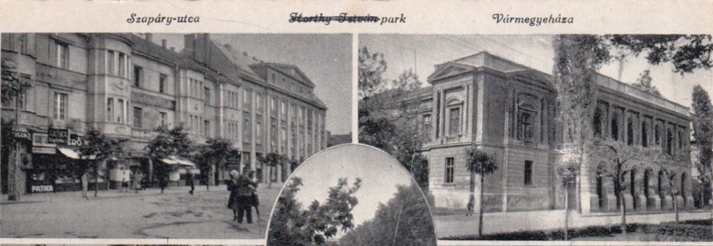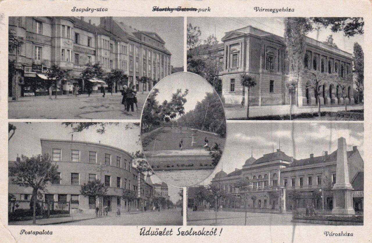 A lap képes oldalának bal felső fotója a Szapáry utca akkori elejét, az 1929-ben épült Nerfeld-palotát és az 1937-ben átadott Szolnoki Hitelbank épületét mutatja. A képeslap írója nagyjából ugyanígy láthatta a két épületet az anziksz feladása idején, hiszen ez a két épület kevésbé sérült az ostrom idején. A Nerfeld-palota 1981-ben tűnt el, hogy helye legyen a mai Árkádnak, a Szolnoki Hitelbankból pedig a szocializmus monopol lakossági bankjának, az Országos Takarékpénztárnak a szolnoki fiókja lett, amit ma is „nagyótépéként” emlegetünk. A két hölgyet és egy csendőrt is megörökítő fotó sok mozaiklapról ismert, miként a jobb felső, a Vármegyeházát mutató kép is. Ez is a harmincas években készült, amit nemcsak az ismert önálló képeslapok postázási dátuma támaszthat alá, hanem az épülettel együtt megörökített növények is.