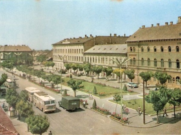 A teret körbevevő „új” házak itt még nem láthatók, hiszen a hatvanas évek második felében épületek. Ha a kép balszélét megnézzük, a Kossuth tér és a Táncsics utca torkolatánál még egy földszintes, cseréptetős házat látunk, aminek a helyére később az úgynevezett „lordok háza” épült. A tér végén, a kép balján álló Steiner Jakab féle ház ugyancsak annak az évtizednek a végén tűnt el, hogy előbb parkoló, majd a jelenlegi rendezvénytér legyen a helyén. A múzeum két oldalán sem a modern lakóházak állnak még, sőt nyugodtan nézzünk el a házak között és fölött. A nyugdíjbiztosító székház sem zárja még le a Hubay utca felőli torkolatot, és a Vízügyi székház sem magasodik a város fölé, mert azok a fotózás pillanata után majdnem másfél évtizeddel később készültek el.