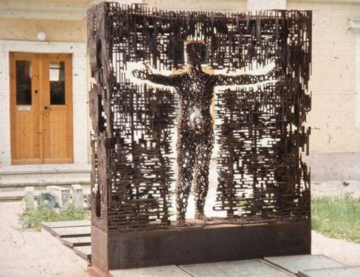 Ennél kicsit szerencsésebb, így nem is reménytelen Laborcz Ferenc 1970-es Vonulók című alkotásának a sorsa (Az alábbi kép a kozterkep,hu oldalról származik). A Vonuló óvodások illetve nem túl szalonképes névvel is emlegetett fém szoborcsoport a Sóház utca végén, nagyjából a mai Rózsapark szélén állt. Sorsát egy ügyetlen teherautó sofőr pecsételte meg egy szerencsétlen manőverrel. A számtalan családi fotón szereplő, sokak emlékében is élő kedves szobor azonban nem egy fémkereskedésben végezte, hanem a szobrász lányánál, aki állítólag nem zárkózik el annak rendbetételétől és újbóli felállításától. Ami már csak azért is lenne logikus, mert tudtommal ezek a köztéri műalkotások a megrendelő, azaz a város, tehát a mi tulajdonunkat képezik.