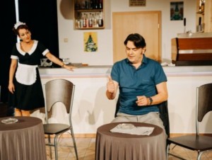 Szeretem, ha olykor szokatlan helyen mutatnak be színdarabokat. Talán mert egyszer, Németországban, egy felhagyott kenyérgyárban úgy láthattam az Operaház átírt fantomját, hogy a színészekkel együtt, a padlástól a pincéig bejártuk a különös épületet. Ha jól emlékszem, vagy nyolc éve, a Gőzben című előadással volt utoljára ilyen élményem Szolnokon, amit annak idején a Tisza szálló fürdőjében játszottak. Meg is lepődtem, amikor a Szín-Mű-Hely idei második bemutatójára megérkezve azonnal a játéktérben találtam magam. A Szigligeti Színházban szinte minden évadban vendégeskedő Málnay Levente ugyanis úgy döntött, hogy Karinthy Ferenc Dunakanyar című egyfelvonásosát a kicsit átalakított szobaszínházi büfében játszatja el Kertész Marcellával és Mihályi Győzővel.