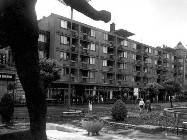 A mából nézve persze örülhetünk, hogy ez a kép így maradt meg az utókornak, hiszen a szobor alfele alatt átnézve képet kaphatunk a városháza épületének megpróbáltatásairól is. Nem elég, hogy a második világháborúban elpusztultak a kupolái, bezártak a földszinti üzletei, sikerült a szocializmusra jellemző, undorító, vaskeretes kockaportálokkal is megerőszakolni a házat. Így fél évszázad távlatából tényleg kár már ezen morfondírozni, de azért volna mit kérdezni azoktól a tervezőktől és pecséttel ellátott korabeli hivatalosságoktól, akik ezt elkövették, hogy mégis mit gondolnak a szépről és az építészeti stílusok összhangjáról.