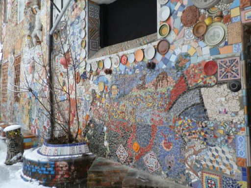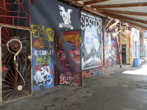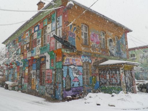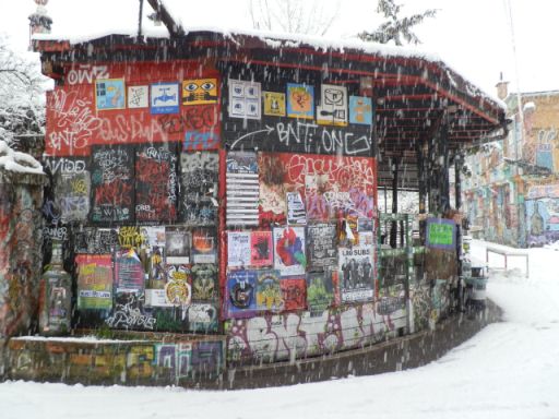 Pedig sokat nem költhettek rá, inkább hagyták, hogy fiatal képzőművészek, zenészek és mindenféle alternatív figurák vegyék birtokba, aztán meg az ő kedvük szerint fejlődjön organikusan. A működtetők a kezük nyomát azóta is otthagyják az épületek falain és a kertben. Aminek köszönhetően egy modern hippivilág született, ahol olyan érzése van a látogatónak, mintha egész évben Sziget lenne. És ehhez hozzájárulnak a kisebb-nagyobb, néha egészen rossz elrendezésű koncerthelyszínek, a romkocsmák, a fogdából kialakított hostel, és persze a programok. Talán nem véletlen, hogy a magyar Tudósok zenekarnak is itt található az egyik legkedveltebb külföldi koncerthelyszíne. Az egész egy nagy, színes, szórakoztató kavalkád, ahol a ma már vagyonokat érő képzőművészeti alkotások és installációk éppúgy megférnek, mint a grafittik vagy finom társadalmi üzenetek. Még szakadó hóesésben is egy szabadtéri kiállítás az egész, ahol órákat lehetne eltölteni csak egy-egy falrészlet előtt is.