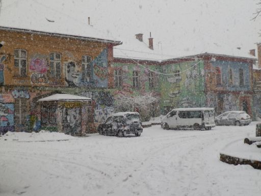 Amit szinte egyetlen fal választ el, egy teljesen másik, a sztereotip Ljubljanába nem illő világtól: a Metalkovatól. A szlovén főváros legizgalmasabb, nagyjából háromhektáros bulinegyedétől. Ahol eddig kétszer volt szerencsém megfordulni, de minden alkalmam csak éjszaka, lényegében esőben és sötétben, leginkább csak a hat-nyolc koncerthelyszínt – kisebb-nagyobb klubot – belülről megtapasztalva. De mindkét alkalommal éreztem, hogy ezt a helyet világosban is látnom kell. Az csak az én pechem, hogy amikor végre napközben is eljutottam a ljubljanai pályaudvar közelében lévő Metalkovába, óriási pelyhekben szakadt a hó, így alig tudtam fényképezni.