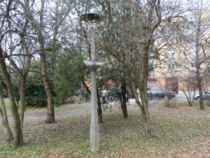 Mármint ennek a szép régi lámpatestnek az alja a Hősök terén, az SZTK előtt. Ahogy elnézem, a benne lerakódott szemét, levelek vagy fészek lehetett a lecsúszás oka. Világítani így is világít, maximum a szépérzékünket sérti. Ebben meg nem vagyunk egyformák. A lámpa gazdájának a szépérzéke biztos, a búrával együtt csúszott le.