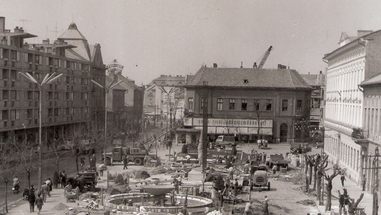 Ám 1961 kora őszén a szobornak csak a talapzata készült el a Kossuth téren. Minden bizonnyal ekkor távolították el a térről a 68-as gyalogezred obeliszkjét, ami 1872 óta állt a Magyar Király Szálloda, a hatvanas évek elején már Damjanich János Múzeum előtt. És ekkor kezdte Dávid Ferenc tervezni a két egyforma szökőkutat is a térre, amit vagy az „ellenforradalom” leverésének ötödik évfordulóján, vagy három nappal később, november 7-én akartak felavatni. Ám ez éppúgy nem történt meg, mint a szobor elhelyezése, ami 1962-ben már komoly téma lehetett a városban. Legalábbis ezt mutatja, hogy a megyei napilap 1962 szilveszteri számában a Luca-székéhez hasonló lassúsággal készülő szoborról jelent meg karikatúra, rajta jól felismerhetően nemcsak a talapzat, de a beton virágtartók is. Ugyancsak ezt mutatja, hogy a megyei újság őszi cikkében nemcsak azon háborgott, hogy még mindig nem áll a szobor, de Simon Ferenc mellőzését is ismét felhánytorgatta.