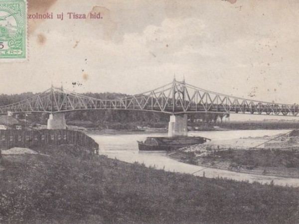 A képeslappá lett fotón látható, a Budapesten ma is álló Szabadság – átadásakor Ferenc József – hídra nagyon emlékeztető folyami átkelő 1911 és 1944 között Szolnoknál ívelt át a Tisza felett. Nagyjából ugyanazon a helyen, ahol ma a névtelen belvárosi Tisza-hidat találjuk. Feltételezhetjük, hogy a Zagyva és a Tisza torkolata környékén legalább félezer éve állandó hidat találhattak az erre utazók, de talán azon se lepődnénk meg, ha ennél régebben is lett volna itt átkelő. Talán köztudott, hogy a XIX. század második felében ácsoltak utoljára fából hidat erre a helyre, amit aztán 1909 márciusában elvitt a jeges ár. A következő két évben komp kötötte össze a két partot, miközben zajlott az első vasból és betonból épülő közúti híd kivitelezése. Az új hidat 1911-ben adták át.