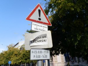 Folytassuk a zavaros, szolnoki közlekedési táblák sorozatunkat! Amit az élet ír. Vajon lehet ennél zavarosabb táblakiegészítéseket elkövetni? És még csodálkozunk, hogy egyesek megszokásból vezetnek. Miért, a szolnoki táblák alapján jobb lenne? Figyelem! Mire is? A Sóház út lezárva - hirdeti a lelógó papírlap. Most ez komoly? A kocsiból is jól olvasható időpont tábla is? Ami máskor az úttisztításra és a parkolási órák használatára figyelmeztet, és gyalogos olvasásra szolgál. Dobogós megoldás! De tudjuk: a jó szándék is (...) van kikövezve.