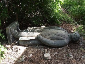 – Hosszasan bolyongtunk azon a viszonylag nagy területen, még nem szembe jött egy úr, akit megkérdeztünk, hogy tud-e valamit a szobrokról. Mire visszakérdezett, hogy talán a művész vagyok, azért keresem őket. Mondtam nem. Így bevallotta, hogy ugyan még nem látta őket, de az egyik bokor alatt van valami. Így bukkantunk a Munkásmozgalmi emlékmű jellegzetes alakjára. Le van fektetve és eléggé benőtte a növényzet, ezért nem vettük észre. Sajnos, mások szemfülesebbek voltak, láthatóan néhány napja lefűrészelték az egyik lábát.