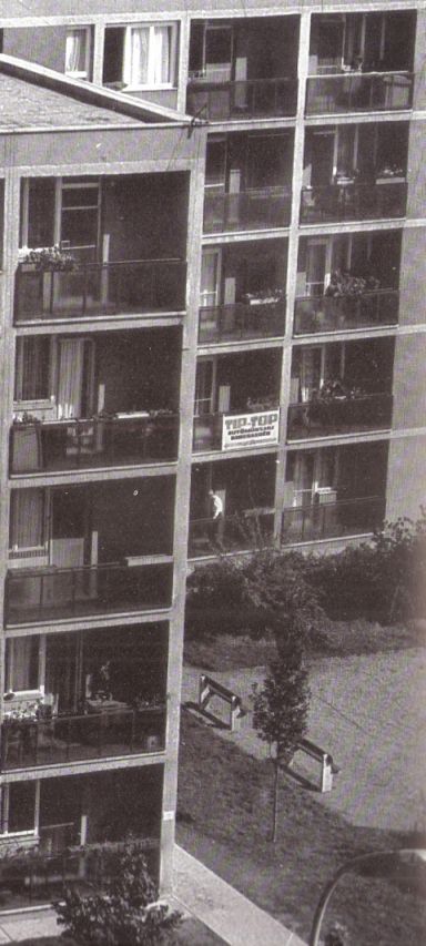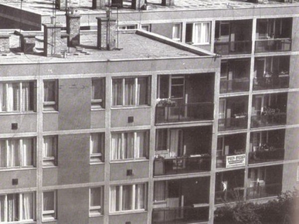 A Várkonyi tér ötszintes társasházait valamikor a hatvanas évek végén adták át, tehát a kép keletkezésének pillanatában pár évesek lehettek. Ennek ellenére az első apróbb hibák, javítások már megjelentek az épületeken, amint az a fotóshoz közelebb lévő ház bejárata körül is látható. Annak idején sok vicc és kabarétréfa szólt a hazai építőipar teljesítményéről, bár ahogy ma, ezeket a lassan ötven éves házakat elnézem, a kisebb hibák ellenére, építőik maximum lassúak, de nem kontárok lehettek. Hozzátéve, a mából nézve szinte felfoghatatlan, hogy honnan volt elegendő szakember vagy munkás ahhoz a rengeteg házhoz és lakáshoz, amit a létező szocializmus legprosperálóbb időszakában csak Szolnokon felhúztak.