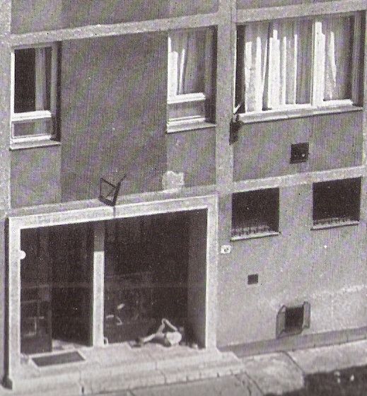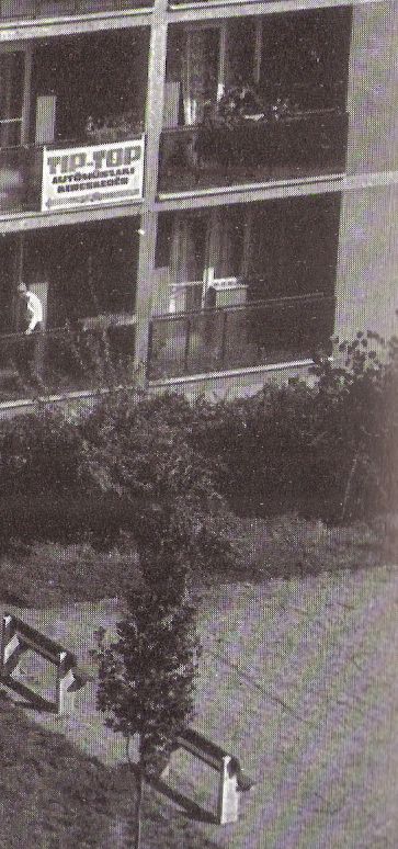 A fotó legérdekesebb momentuma azonban mégis az egyik erkélyhez köthető. A távolabb lévő ház, első emeletének erkélykorlátjára tessék egy pillantást vetni! Mikor is készült a kép? 1974 nyarán. Ám a létező szocializmusban már működött az a maszekvilág, amit a nagy és kisebb testvéreink oly nagyon irigyeltek tőlünk. Amint a fotón látható, korabeli reklám is ezt igazolja. A Tip-Top autóalkatrész kereskedés reklámja függ ott, ami, ha jól sejtem, az épületek mögötti garázssoron még a kilencvenes években is működő maszek autósbolt hirdetése lehet. Pontos információim nincsenek a boltocskáról, de mintha egy idősebb asszonyé lett volna, és ha bármi kellett valamelyik szocialista autónkhoz, biztos, hogy hozzá is benéztünk.
