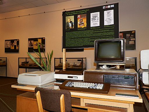 A kiállító terem közepén felállított két számítógépre és a mögöttük lévő tablókra is érdemes pillantást vetni. Mert miközben mi a Spectrum vagy Commodore vitát folytattuk, már Magyarországon is építették az első kísérleti PC-t. Természetesen az IBM szabadalmai alapján. Ami az akkori irodatechnikát fémjelző, mosógép méretű könyvelőgépek, traktor módjára zörgő írógépek és stencil masinák korában futurisztikus dolognak tűnhetett. És a kiállításon látható hirdetésben olvasható árak alapján sokáig elérhetetlen is lehetett, hiszen ki engedhetett meg magának akkoriban 300-800 ezer forintért – kettő-öt új 1500-ös Lada ára – egy ilyen masinát.