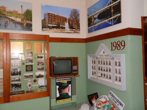 Rólam nem is beszélve, aki természetesen elájul attól, hogy a múltszázad nagy árvize lehet egy város múzeumban mutogatott történelme. Amint azon sincs szégyenkeznivaló, hogy a Rákosi- és a Kádár-kor sem kerülte el a települést, sőt volt 1956 és visszarendeződés, meg még rendszerváltás is lecserélt intézményi táblákkal és „Továris konyec” plakátokkal. Mindezek alapján nekem még az is belefér, hogy bár a kiállítás címében 1989 a záró dátum, azért a rendszerváltás utáni első, helyi képviselőtestület tablója is helyet kapott a falon. Persze más az a mentalitás, ahol az 1990-ig a főtéren álló emlékművet nem kidobták, hanem a múzeumban raktározzák.