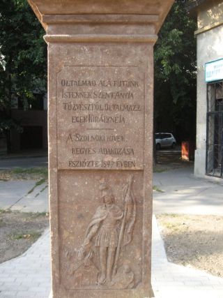 A szeptember 12. óta, a Máira utca belvárosi templom felőli végén ismét álló Mária szobrot először 1847. május 24-én állították fel Szolnokon. Bő másfél évszázaddal később, közadakozásból felújították, és eredeti helyétől kicsit távolabb, újból felállították.A Mária-szobrot és a hozzá tartozó talapzatot 1847. május 24-én, a Mária utca 19. számú telken állították fel először. A város hálás lakossága két szolnoki tűzvész sikeres megfékezése után állítatta a szobrot, ami egyesek szerint Bauer Gyula alkotása. Az biztos, hogy a szobor 1951-ben még az eredeti helyén állt – amit Kaposvári Gyula fényképe igazol -, igaz akkor már az időközben odaépített ház egyik ablakmélyedésében. További sorsát, eltávolításának időpontját nem ismerjük. A rendszerváltás idején már a belvárosi templom plébánia hivatalának folyosóján volt, majd valamikor a rákóczifalvai Macimúzeumba került.
