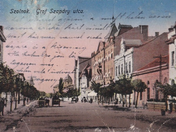 Mivel a felvétel jobb szélén már emeletes a Kádár cukrászda épülete, egyértelmű, hogy ez a lap csak 1912 után, a fák lombkoronája alapján inkább 1913 nyara után készülhetett. Érdekes, hogy a cukrászda előtt milyen komoly teraszkorlát látható. Mellette az Aranyhattyú étterem földszintes épületét látjuk, majd az Ipartestület és a Nemzeti szálló következik. Ha ez a felvétel a harmincas évek elején készült volna – akkor részben nem lenne ennyire silány minőségű a színezés és a papírja sem -, a Nemzeti mellett már állnia kellene a Cinóber-háznak. Ami majd a szolnoki korzó fejlődésének új lendületét jelzi. A papírminőség, a színezés és az utcakép alapján azt gondolom, ez egy első világháború idején készült szolnoki képeslap, amit csak 1927 elején adtak postára.
