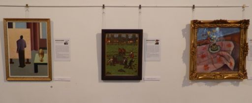 És nem ez az egyetlen ilyen alkotás. Vojnich Erzsébet Váli Dezső műterme című képének olyan mélysége van, hogy majdnem beleszédül a néző. Halász Károly Magasles I-II. festményei pedig úgy játszanak a geometriával, hogy gondolatban, térben kezd építkezni a szemlélő. Kelemen Károly Sziklás önarckép teddyvel képe pedig újra csak orrunkra koppint, hogy lám, soha se tessék elfelejteni, mit, milyen távolból és szemszögből érdemes nézni. Bukta Imre Gyöngytyúkot etető férfije előtt – ami nem festmény, hanem egy térplasztika – pedig természetesen nemcsak a szórakoztató különlegessége miatt érdemes elidőzni, hanem a mester miatt is. Aki kapcsán nyugodtan kijelenthetjük, hogy a fehérváriak egy remek kortárs összeállítást helyeztek el a Galériánk földszintjén.