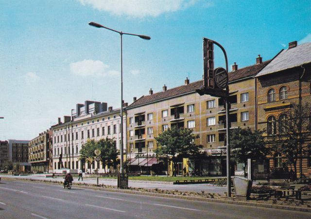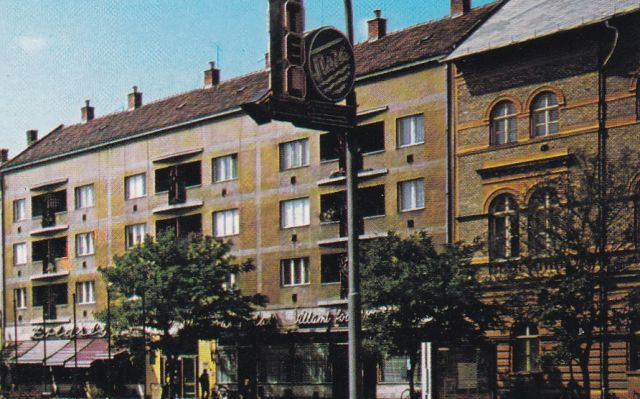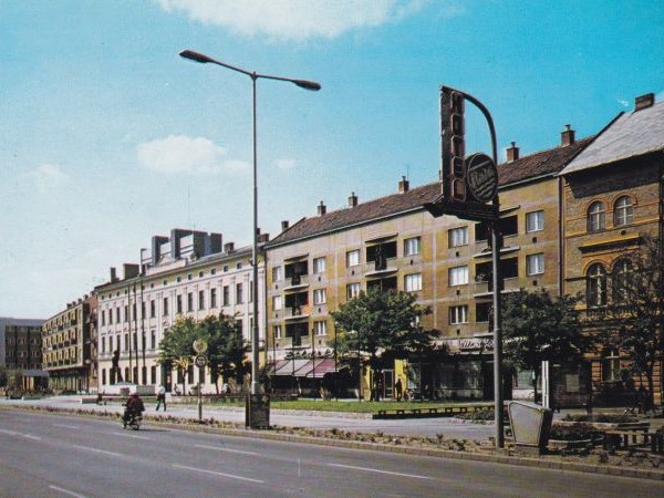 Érdekes egyébként, hogy bár 1975 és 1990 között ezen a helyen robogott át a 4-es főút forgalma, a fotósnak egy autók nélküli pillanatot sikerült elkapnia. Csupán egy motorkerékpár tart a Ságvári kereszteződése felé, aminek a márkája kibogarászhatatlan, az azonban látszik, a két utas eléggé megterhelte a kétkerekűt. Azt hiszem, erre a fotóra tényleg igaz, hogy „állni látszik az idő”, és itt nem csak egy szekér, hanem egy motor halad.