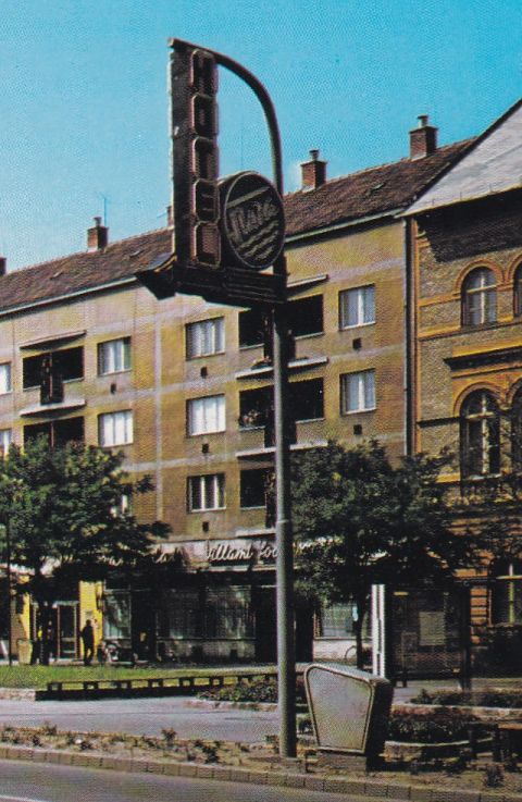 A mellékelt képeslapot elsősorban a felvétel jobb oldalán látható fényreklám miatt vettem meg, ami egyébként segíthetne a fotózás lehetséges időpontját szűkíteni. A Hotel Tisza felirata és a Táncsics utca felé mutató nyíl az én emlékeimben ugyanis egyáltalán nincs meg – szemben a legendás Casco és az OTP Kossuth téri reklámjaival -, így nem zárom ki, hogy valamikor a nyolcvanas évek elején bontották el. Talán azért is, mert ha jobban megnézzük, akkor láthatjuk, elég barkácsmódszerrel készült reklámeszközről van szó. Nagyon úgy tűnik, hogy az utcai közvilágítás aktuális korszerűsítése közben juthatott valakinek az eszébe egy feleslegessé vált lámpaoszlop újrahasznosítása. Hiszen ki volt benne építve a villanyvezeték, így csak rá kellett applikálni a három elemből álló fényreklámot. Egyébként a város főterén, a városi tanács székházával majdnem szemben. Lehet, hogy a nem sokkal korábban átadott Pelikán Hotel Keletről érkező vendégeit akarta így elhappolni a Tisza szálló? Micsoda idők lehettek!