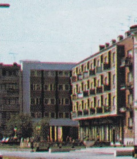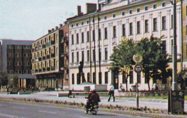 A fotó jobb szélén lévő, ma könyvtárként funkcionáló épületben városi, középiskolai, leánykollégium működött, bár a tetején még ott volt az őrtorony. A mellette álló háromemeletes társasház földszintjén a környékbeli téeszek termékeit kínáló zöldségest, illetve az „Állami fodrászat” felirat alatt férfi és női fodrászüzletet találhattunk. Mindkettő hosszú évtizedeken keresztül hozzátartozott a térhez.