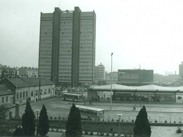 Ám ezen a képen még Szolnok első, akkor korszerűnek mondható buszpályaudvara látható, jellegzetes tetejével. A létesítményt eredetileg Szolnok 900 éves jubileumára kellett volna átadni, de végül csak 1976-ra készült el, majd szolgálta a várost bő három évtizeden keresztül. Építését annak idején a megye és a Szolnok környéki települések is finanaszírozták, elvileg jubileumi ajándékként, valójában azért, mert miattuk is épült. A buszpályaudvar egyébként nemcsak a képen látható utasforgalmi épületből állt, hanem egy köralakú szolgálati tömbből is, ami a rádió másik oldalán állt. A buszpályaudvart a hetvenes évek közepén azért volt fontos megépíteni, mert a távolsági járatok korábban a Szabadság téren, a Tisza-híd belvárosi felhajtójánál várakoztak és forogtak, akadályozva az időközben korszerűsített 4-es főút egyre növekvő forgalmát.