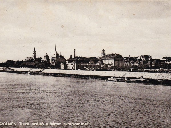 E képeslap címe: „Szolnok. Tisza szálló a három templommal”. Azaz ekkor Szolnok még büszke volt, lehetett a folyóparton sorakozó három felekezet templomára, ami egyben a város nyitottságát, be- és elfogadó jellegét is jól tükrözte. Egyébként, ha a fotós csak egy picit is önmagának jobbra mozdította volna a kameráját, akkor a negyedik Tisza-parti templom is rákerülhetett volna a képre, hiszen 1932-ben már az is állt. A megnevezett és megörökített három templom között a mai Szegő Gábor Általános Iskola teteje is feltűnik, ami a fotózáskor ugye polgári leányiskolaként működött, és talán éppen akkoriban költözött ki belőle az Ellmann Elvira alapította szolnoki leánygimnázium, hiszen az új posta megépülésével a Bánffy – később Varga – Katalin gimnázium kapta meg a Szabadság téri Obermayer-házat.