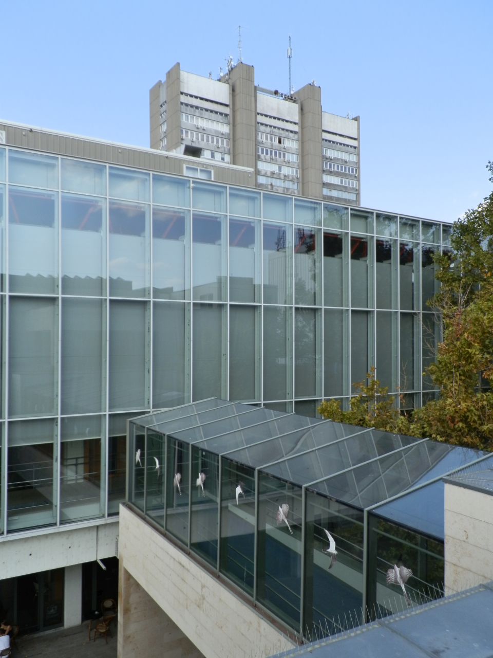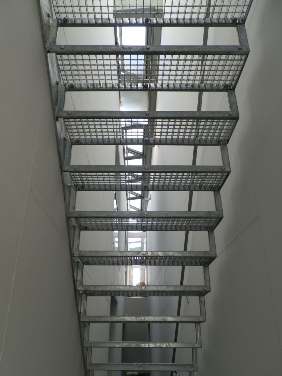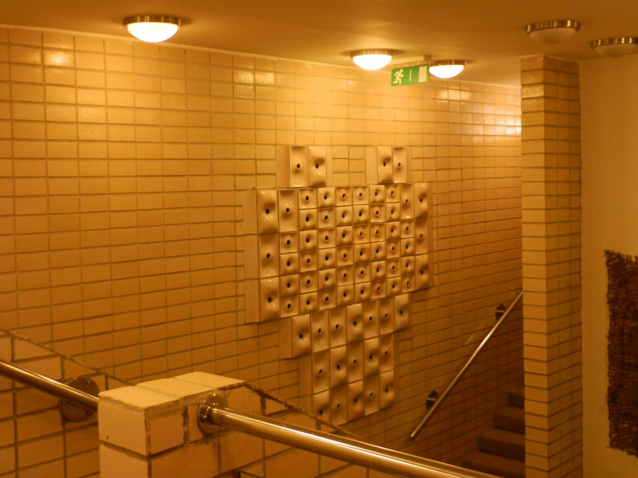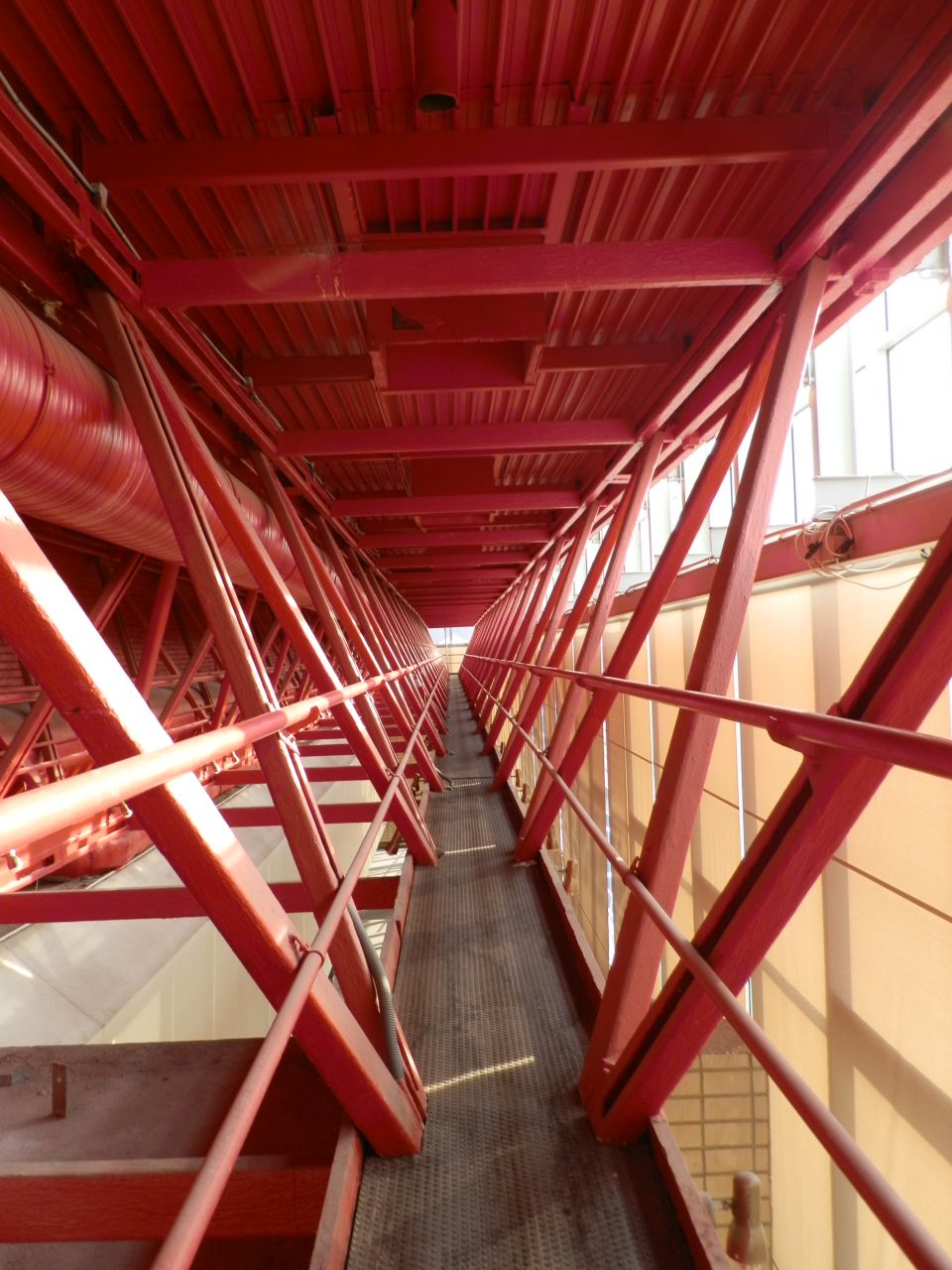 A vezetett épülettúra alkalmával a buszpályaudvar felőli „torony” lépcsőházán keresztül jutottunk fel a piros tetőszerkezet aljára. Közben itt is megcsodálhattam annak a különleges kerámia sorozatnak az egyik darabját, amely szerintem ugyanúgy védjegye a háznak, mint az üvegbúra és a piros vasgerendák. Igaz, ha jól számolom, az összesen tíz faliképnek jelenleg nem ismerjük sem az alkotóját, sem a címét, sem az üzenetét. (De, ami késik, nem múlik!) A kulturált lépcsőház után már csak a műszakiak által használt létrákon és pallókon közlekedtünk.