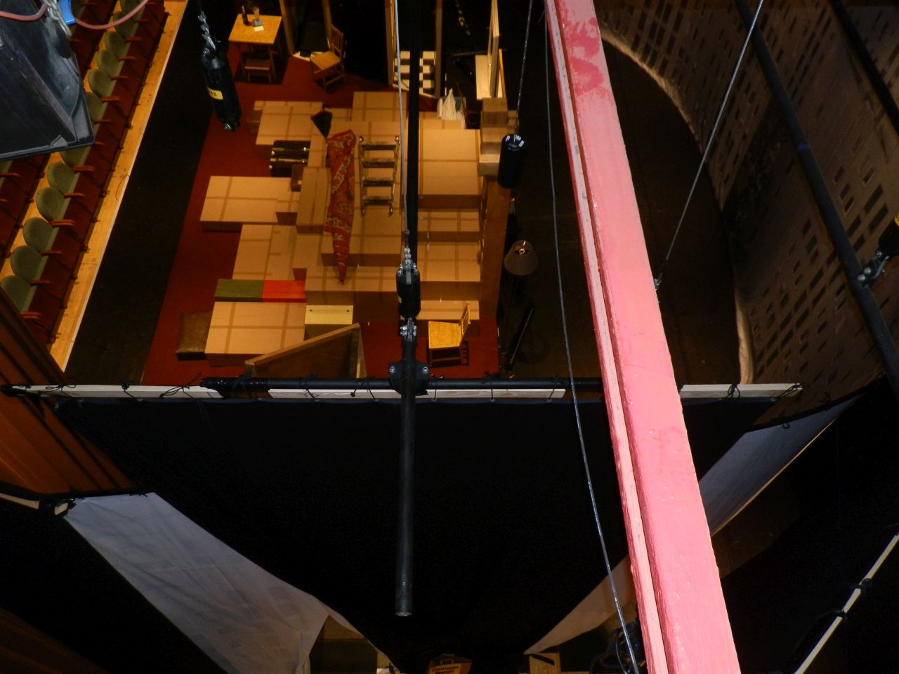 Az ember sokszor szeretne benézni a színházi kulisszák mögé. Az viszont ritkán jut eszébe, hogy akár a színpad fölül is megnézhetne egy előadást. Mivel a színpad felől – fölül – jutottunk be a közel félezer székes nézőtér fölé, mondhatjuk azt is, hogy a Szigligeti Színház ideiglenes zsinórpadlásán is jártunk, alattunk pedig éppen a Kulcskeresők díszletei álltak.