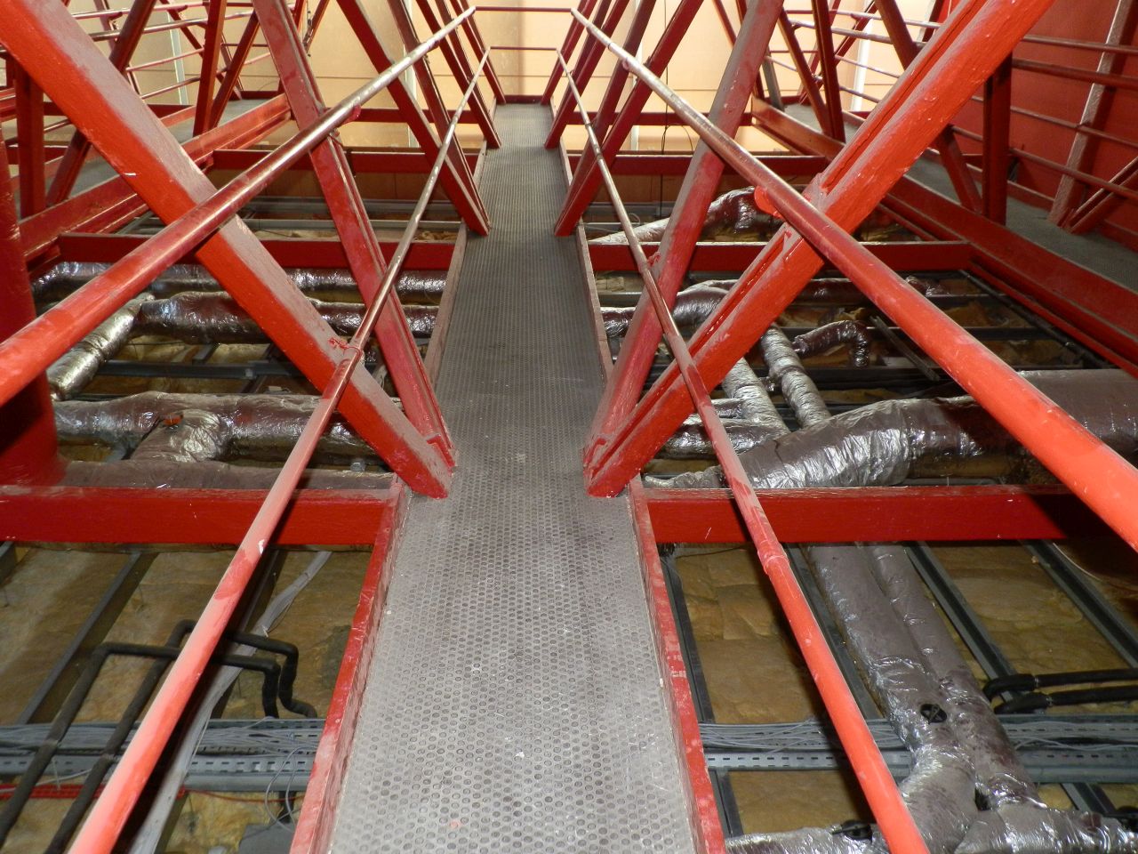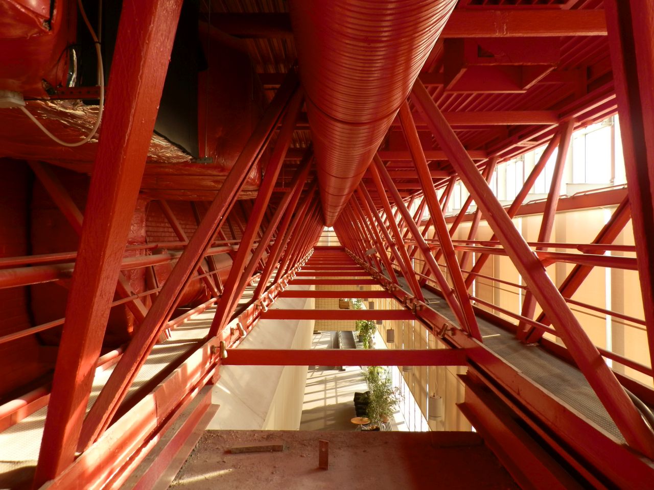 Az épület a piros tetőszerkezet pallóin teljesen körbejárható. Így visszafelé az egykori balett terem fölött egyensúlyoztunk, majd a Hild tér felőli oldalon, ha jól emlékszem, az első emelet padlószintje fölött 9-10 méterrel sétálva jutottunk vissza az Agóra felőli oldalra. A piros traverzeken vezető „körút” egyéként több mint tíz, hosszirányú, alulról nyitott folyosót köt össze az épület tartógerendáiban.