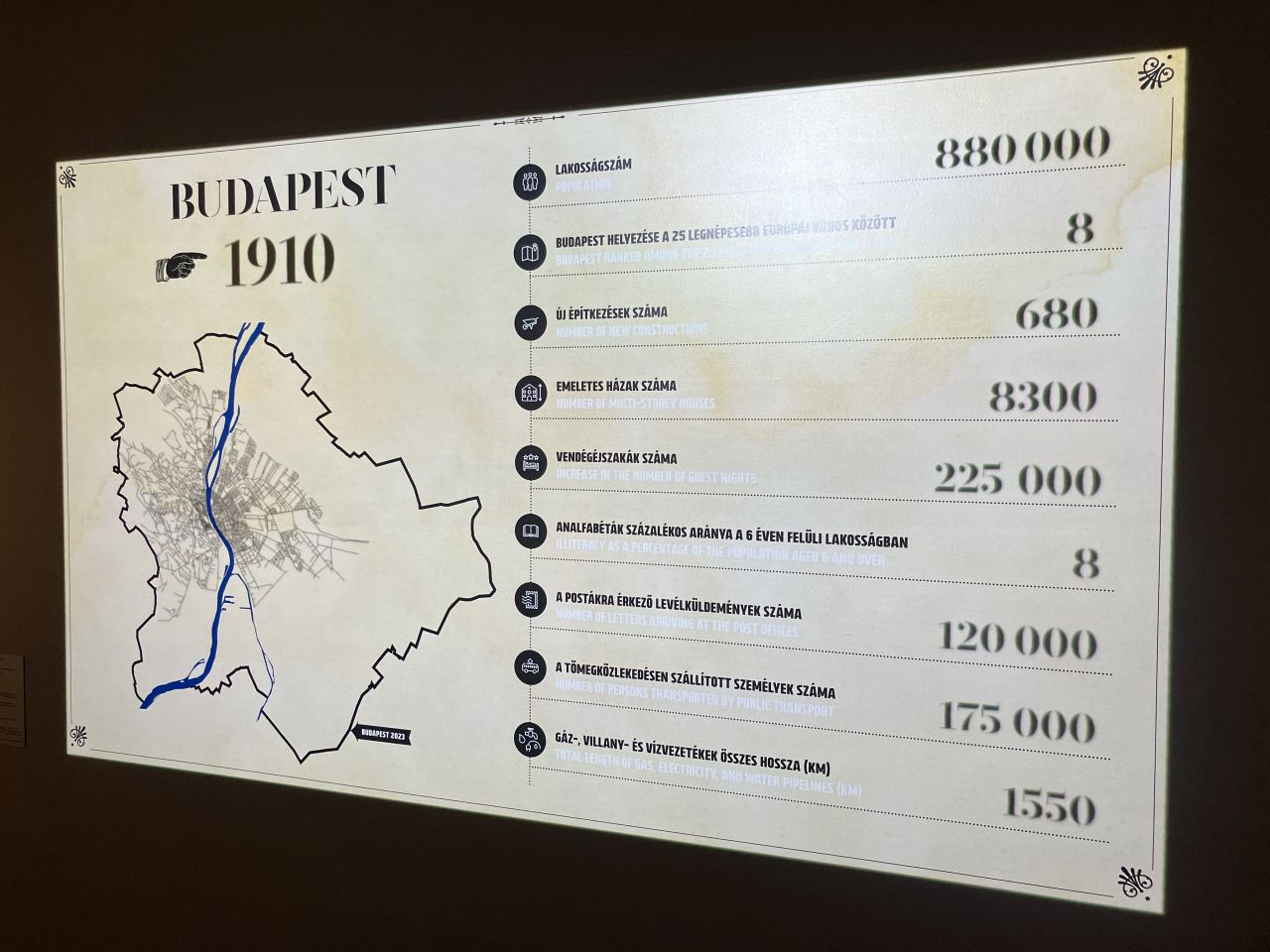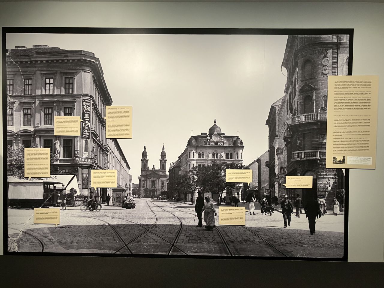 A „Budapest. Az első aranykor” című kiállítás apropója nemcsak a főváros létrejöttének 150 éves jubileuma, hanem a nagyszerű Fortepan.hu felfedezése, amit az 1793-ban alapított és 2019-ig működő (igen, 226 év), jó ideig képeslapok kiadásával is foglalkozó német Brück & Sohn cég archívumában tettek. A német cég az előző századforduló környékén ugyanis Magyarországról is adott ki képeslapokat, amihez rengeteg fotót készítettek. A Fortepanosok a Budapestre vonatkozókat tárták fel, és tették a Magyar Nemzeti Galéria kiállításán (is) láthatóvá és közkincsé. Úgy, hogy egy pillanatra sem feledkeztek meg arról: Budapest a világvárossá válása miatt volt akkoriban rendkívül érdekes. És ez nemcsak a felnagyított, illetve eredeti méretben létható képeslapokon köszön vissza, hanem például egy olyan installáción is, ami a főváros terjeszkedése mellett számtalan adattal érzékelteti a metropoliszunk fejlődését. (Egyszerű, de remek ötlet.)