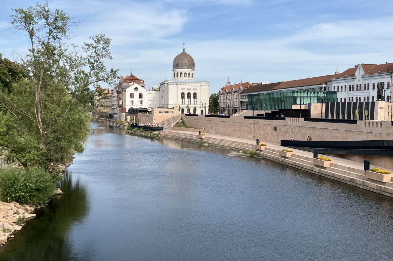 em először hozom példának a Sebes-Körös nagyváradi szakaszát, amelyik úgy tűnik, szinte egész évben ugyanakkora magasságú a városban. Ennek köszönhetően a partján, szinte a víz közelében gyalogút vezet, kicsit fentebb sétány halad, karnyújtásnyira pedig vendéglátóhelyek és rendezvényhelyszínek találhatóak. A Sebes-Körös valóban Nagyvárad része. Nem vagyok vízügyi szakember, nem ismerem az ottani vízjárást, csak azt látom, hogy a belvárosi szakaszon megépített medergátak remekül tartják a folyó szintjét. Ezek nem valami bonyolult műtárgyak, hanem olyan, a mederben keresztbe épített betonfalak, amelyeken a magasabb víz simán átbukik. Mondom, nem értek hozzá, gőzöm sincs a biológiai következményekről, nem tudom, hogyan viselkednek a halak, csak azt látom, hogy a folyó a várossal együtt létezik.