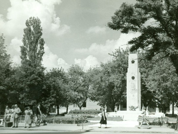 Nem tudjuk, pontosan mikor állították fel és mikor bontották el. Nagyjából négy és fél évtizeden keresztül állt a Hősök terén, az SZTK előtt a talán „szovjet katonai emlékmű”, aminél olykor évente négyszer is koszorúztak. Főleg, mert közel másfél évtizedig ez volt a helyi felszabadulási emlékmű is.