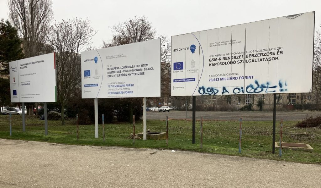 A címlapkép és ez 2026. február 2-án reggel készült a szolnoki vasútállomás területén, a kiállított mozdony után, az 1-es vágány melletti peronnál elhelyezett táblákról.