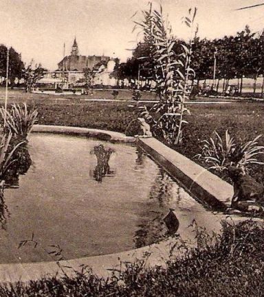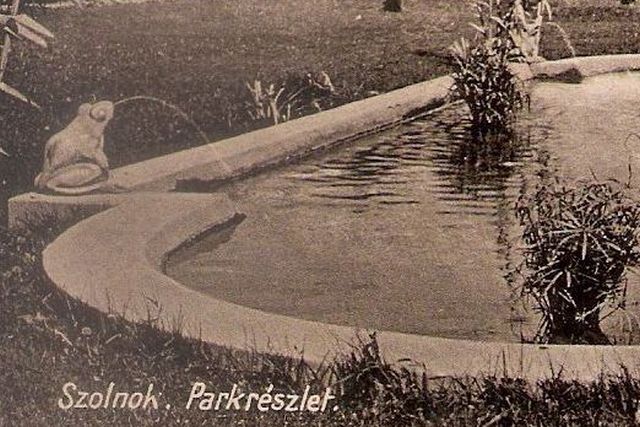 Az első, amiben szinte biztosan tévedek, de nem hagy nyugodni, hogy úgy tűnik, mintha a békás szökőkútnak, a hídhoz közelebb lett volna egy párja. Ezen a fekete-fehér, kissé homályos felvételen ez nem egyértelmű, bár akárhogy nézem, hajlamos vagyok azt látni, hogy a képet szinte megfelező ösvény túloldalán ugyanolyan nádakkal és békákkal szegélyezett medence van, mint az előtérben. Hozzáteszem, ennek sehol máshol nincs nyoma. Ugyanakkor egy ekkora parkban simán elférhetett két kút. Sőt, Szolnok 1927-ből ismert térképén is úgy látszik, mintha két medence lenne a parkban. Talán szemtanukat kellene megkérdezni, akiknek nagyjából nyolcvan év távlatából emlékeznek a park elrendezésére.