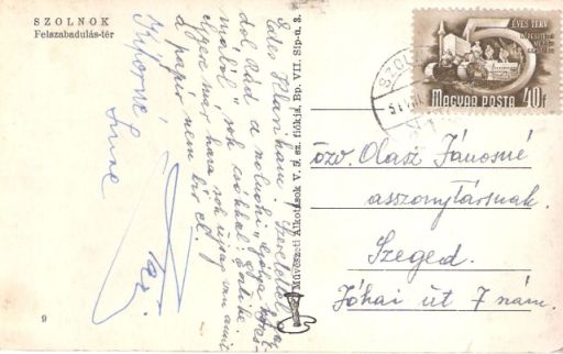 Egyébként erős a gyanúm, hogy az ezt a képeslapot 1950-ben postára adó két hölgyet egyáltalán nem érdekelte, mi van a fotón, vagy mi a neve az ábrázolt térnek. A szöveg ugyanis arról tanúskodik, hogy a – feltételezésem szerint – két barátnő a Gólya kocsmában – tehát az Eötvös tér sarkán – ülve írta üzenetét a valamiért Szegeden tartózkodó barátnőjüknek. Aki nagyon hiányzott nekik, főleg azért, mert számtalan olyan „újságuk” volt, amit „a papír nem bír el”. Hú de jó lenne tudni, miről vagy kiről is akarhattak pletykálkodni azok a hölgyek, akik hatvanhat évvel ezelőtt 40 fillért szántak ennek a rövidke üzenetnek a postára adására, aminek köszönhetően ez a fotó is megmaradt az akkor még létező, ám már akkor is feledésbe merülő szolnoki Felszabadulás térről.