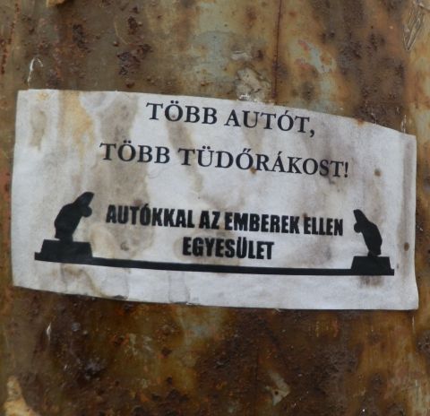 Persze nem árt tudni és tudomásul venni, hogy a pártok és pártpolitikusok ekézésén túl is van utcai falfirka és falmatrica élet. Az egészen szélsőséges, uszító szövegeket tényleg csak a kutatóknak ajánlom, viszont az egy-egy témára reagáló, valódi üzeneteket szinte bárkinek (aki képes ezeket a helyükön kezelni). „A stadion nem színház” matrica például többféleképpen is értelmezhető. A Magyar Labdarúgó Szövetséget minősítő viszont egészen egyértelmű, bár biztos érdekes lenne a tartalom részletesebb kibontása. Az utóbbi idők legjobbjai számomra azonban az „Autókkal az emberek ellen egyesület” nyilvánvalóan groteszknek szánt üzenetei.