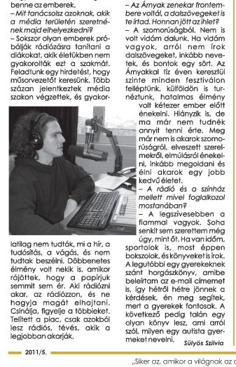 – Sokáig műsorvezető voltam az Aktív Rádiónál, amit nagyon szerettem. Viszont, ahogy idősebb lettem, egyre inkább a komolyabb dolgok kezdtek foglalkoztatni, és egyre többször jelentett terhet, hogy jókedvűnek tűnjek. Ráadásul kezdett zavarni, hogy olyan zenéket játszottunk, amiktől már rosszul voltam. Nem bántásból mondom, csak kezdett közelebb állni hozzám a hírszerkesztés, a riporterkedés. A hírszerkesztésben azt szeretem, hogy adott szabályok mentén kell felépíteni a híreket, holott nem igazán rajongok a szabályokért, sőt! Riportot pedig azért szeretek készíteni, mert egy kíváncsi ember vagyok. Érdekel a világ és benne az emberek…